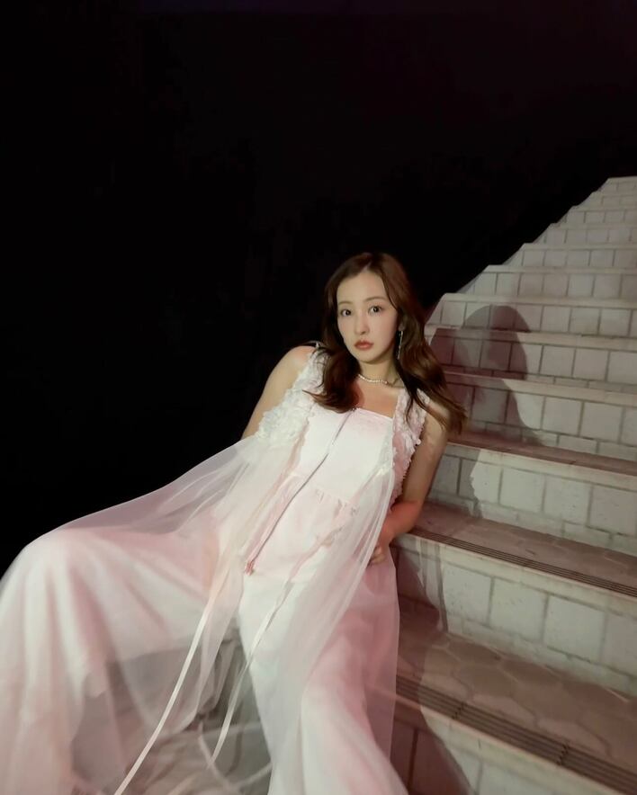 公開された写真には、階段に座りバッチリカメラ目線を決める板野さん。ゆるっと巻いたヘアスタイルで、全身真っ白の衣装に身を包んでいます。
