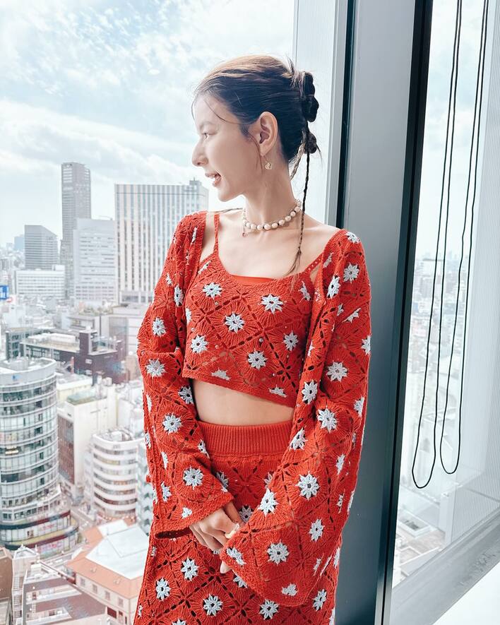 そこには、赤を基調とした花柄の透かし編みのセットアップを身にまとったスザンヌさんの姿が。髪の毛をまとめ、ショート丈のキャミソールからおへそをチラッと出し、微笑む姿が印象的です。