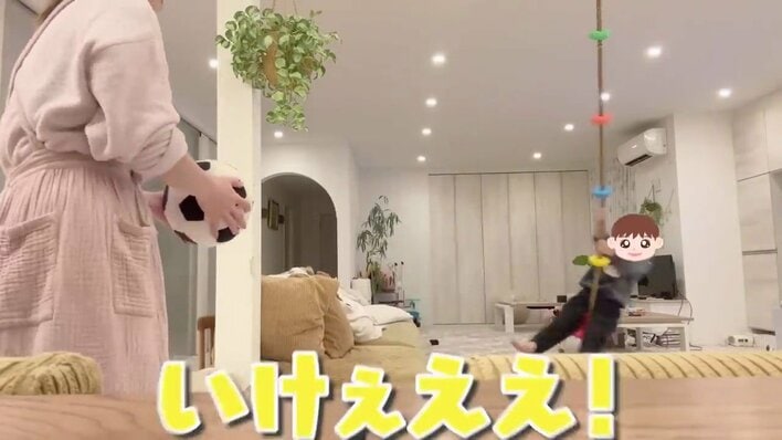 その動画では、リビングの天井からつり下げられているブランコの前で、食べられるシャボン玉を辻󠄀さんが吹いて、幸空くんが食べようと奮闘している姿も!