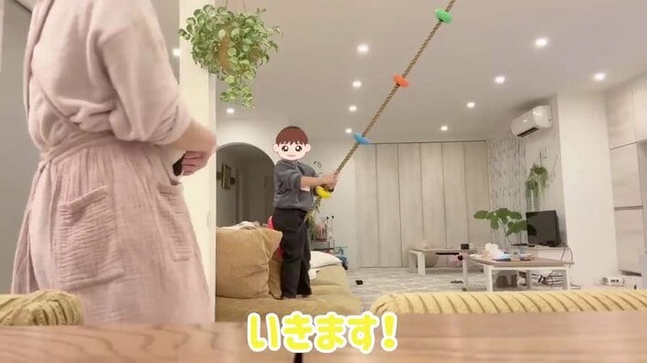 よく見ると、幸空くんは部屋の天井からつるされたロープを手にしているのが分かります!