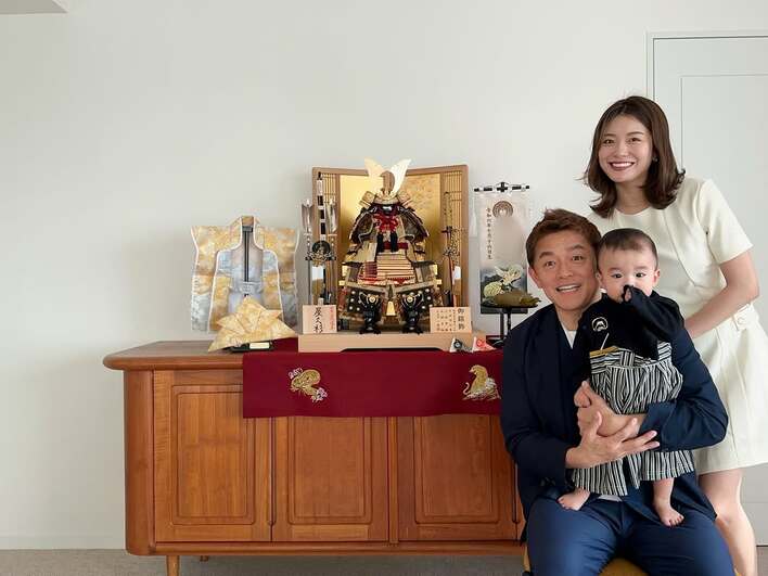 また、豪華な五月人形の横で、蜂谷さんと“ベビバーグ”を抱える井戸田さんの家族3人が映ったショットも!