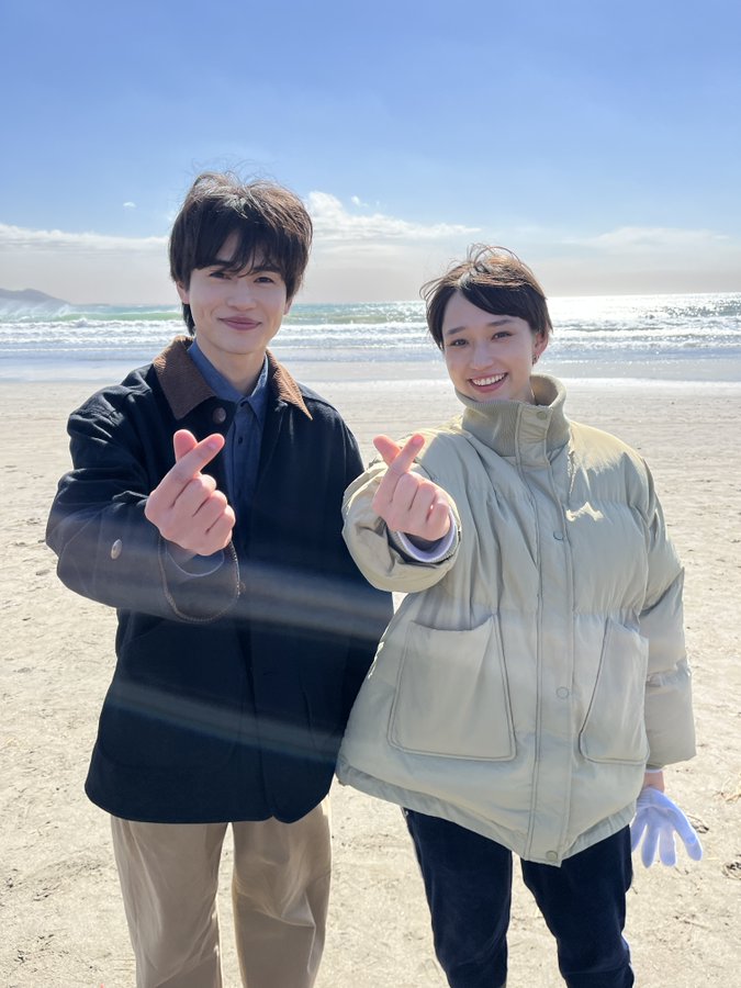 劇中ではまだ謎が多い青年・優斗を演じる西垣さんと、そんな優斗とこれから少しずつ距離を縮めていくえりなを演じる白本さん。2人は、青空と海をバックに笑顔でキュンポーズを披露しています。