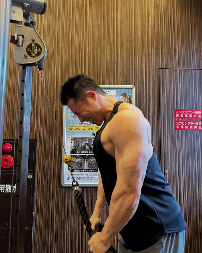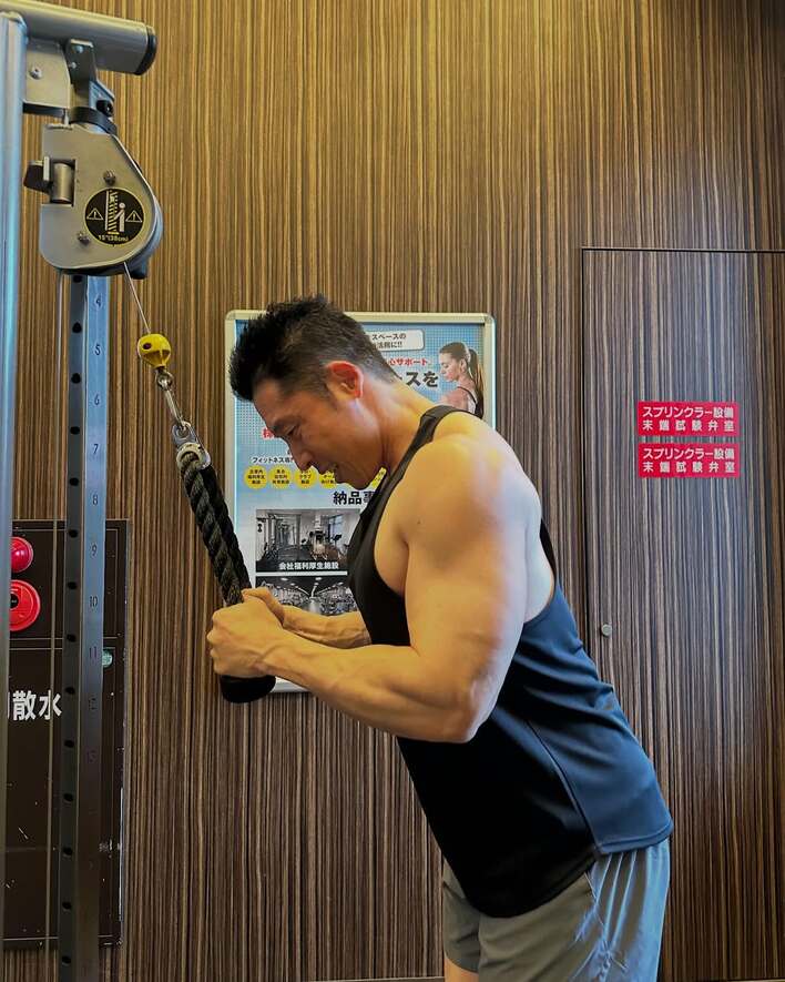 きんに君はハッシュタグをつけて「フォームは 肩を下げて 肘を動かさないように ゆっくりと行う」「収縮した時にグリップを外側に広げるイメージで三頭を絞り込む」などと投稿。