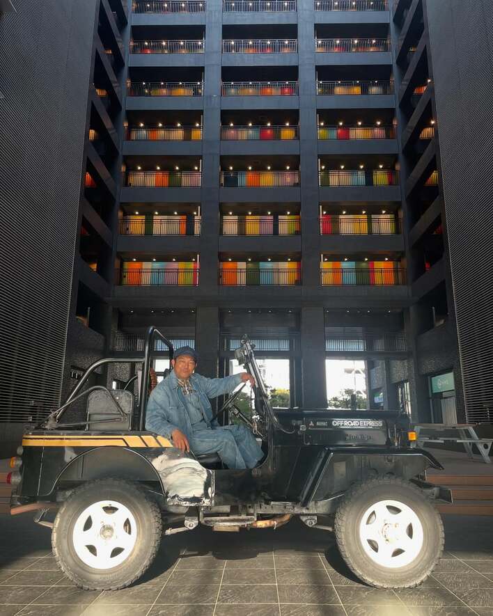 真新しいビルの車寄せのような場所に登場した三菱ジープ。屋根やドアがなく、軍用車のようなオープンスタイルが目をひきます。