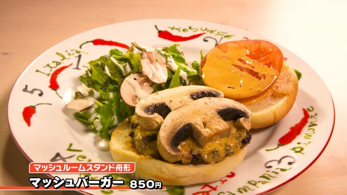 1品目は、巨大で肉厚の山形・舟形のマッシュルームをソテーして乗せた「マッシュバーガー」。直径約10cmのジャンボマッシュルームをメインに使用したビジュアルにもビックリなハンバーガーです。