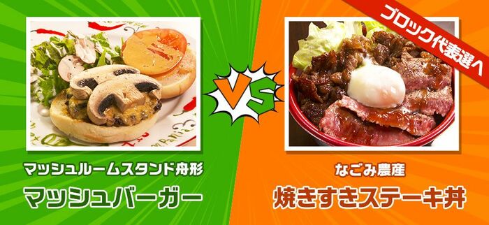 視聴者投票の結果は「マッシュバーガー」22% 対「焼きすきステーキ丼」78%。山形県の新ご当地グルメに選ばれたのは、「なごみ農産」さんの「焼きすきステーキ丼」に決定しました。