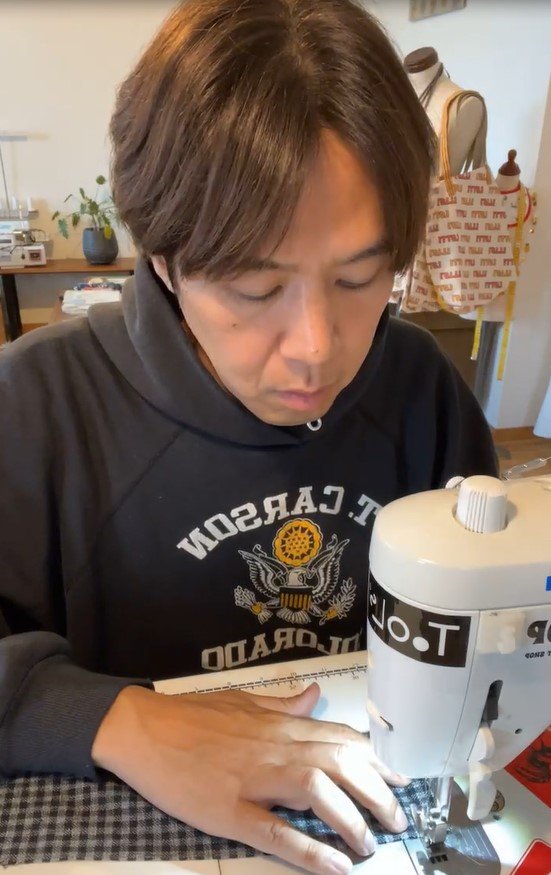 ラフな黒パーカー姿のコカドさん。真剣な面持ちでミシンを動かしていきます。