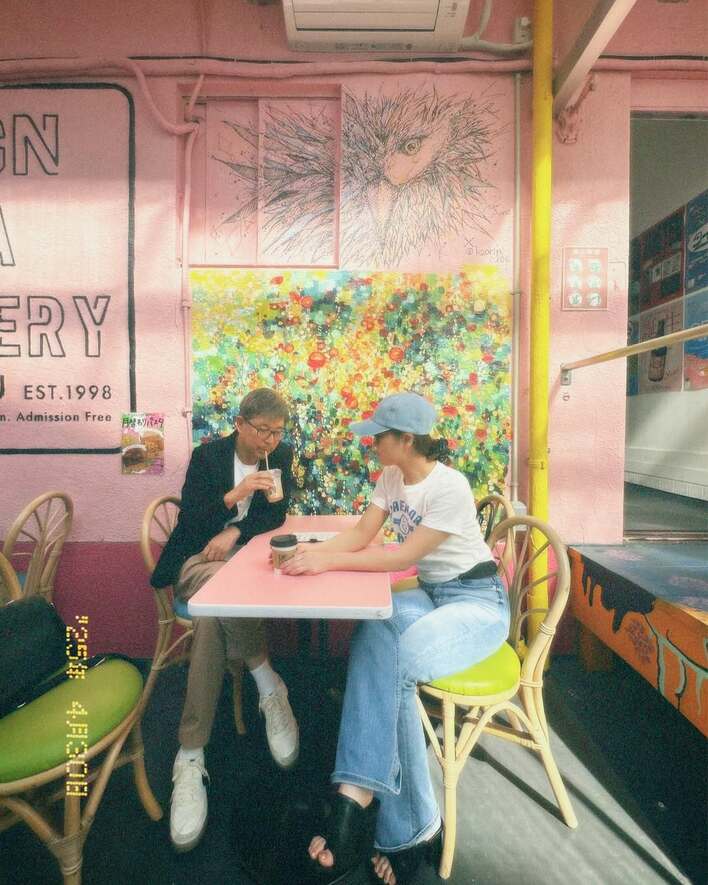 カフェはピンクを基調としたおしゃれな空間で、壁にはカラフルなペイントアートが描かれています。親子仲むつまじく、ゆったりと過ごしている様子は絵になりますね。