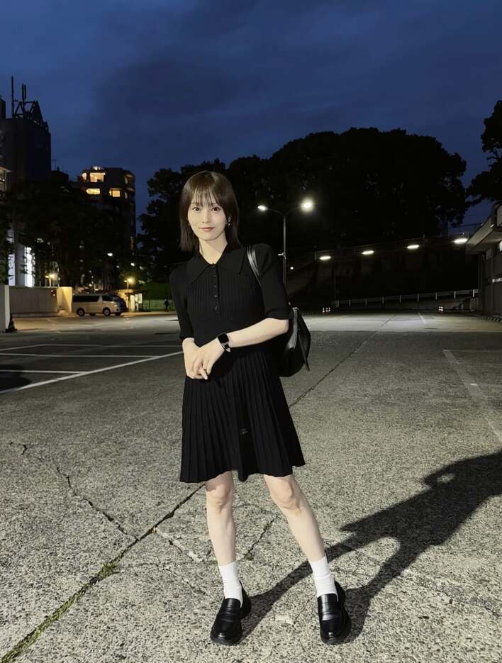公開された写真には、黒のポロニットのワンピースに黒のローファーを合わせたコーディネートの山本さんの姿が!