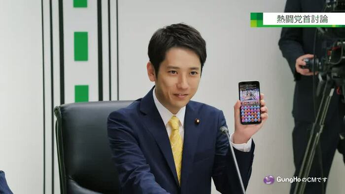 このCMは、「パズドラでもっと明るい日本を」と、新政党“パズドラ党”を結成した二宮の姿を描くシリーズの最新作。パズドラ党の党首として見事当選を果たした二宮が、「パズドラ党/料亭にて」篇では、政界の“ドン”役を演じる竹中直人、「パズドラ党/党首討論」篇では有力政党の党首役を演じる南野陽子を相手に駆け引きを挑む。