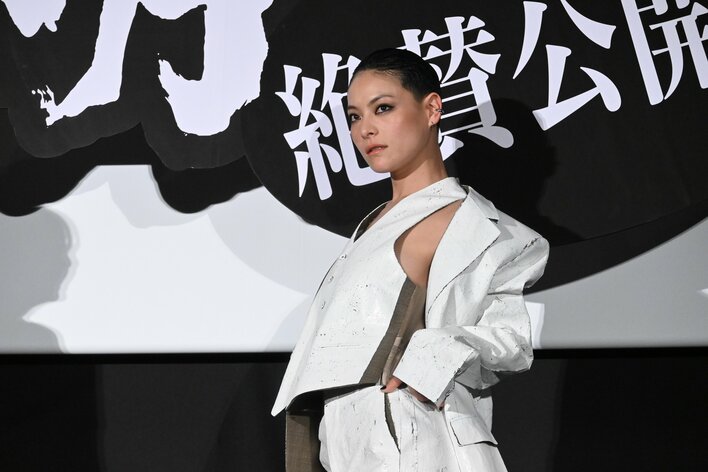 真っ白なセットアップで登場し、MCから、自身が演じている人気シンガー・ミア西表について「ハイレベルなダンスパフォーマンスとパワフルな歌唱で絶大な人気を誇る」と紹介されると、ジャケットを少し脱いで肩を見せてニヤリ。