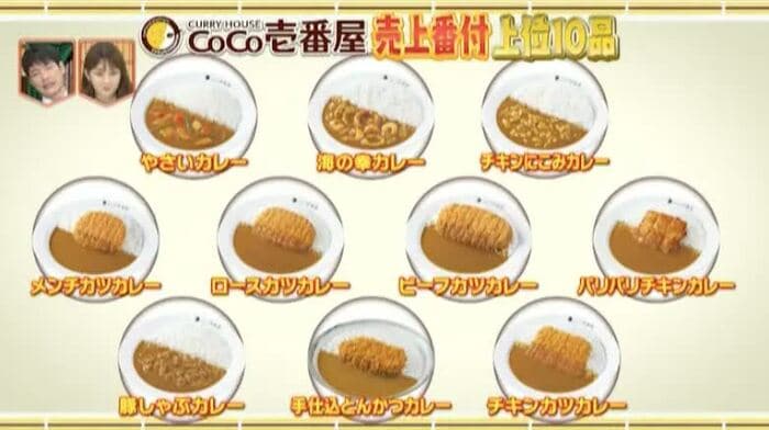 「CoCo壱番屋」の売上上位10品には、揚げ物系やチキン系、魚介や野菜の素材の味が溶け込んだカレーなど、多彩なラインナップが並んだ。