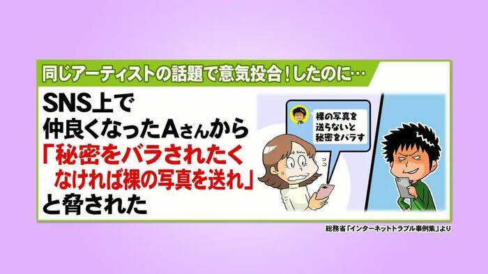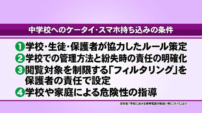 番組では、3年前から携帯電話の持ち込みを許可している中学校の対策も紹介。その学校では定期的にネットリテラシー講座を実施し、「投稿する前に一度立ち止まって考える」「何かあったら周囲に相談する」ことが大切だと教えている。