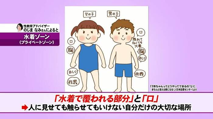 のじまさんによると、自分の体に興味を持ち楽しみながら学んでくれる、3〜6歳の「感動期」から性教育はスタートしてOK。その年齢の子供には、水着で覆われる“水着ゾーン”と“口”が、人に見せても触らせてもいけない大事な場所だと教えると、何が危険なのかを認識できるようになるという。