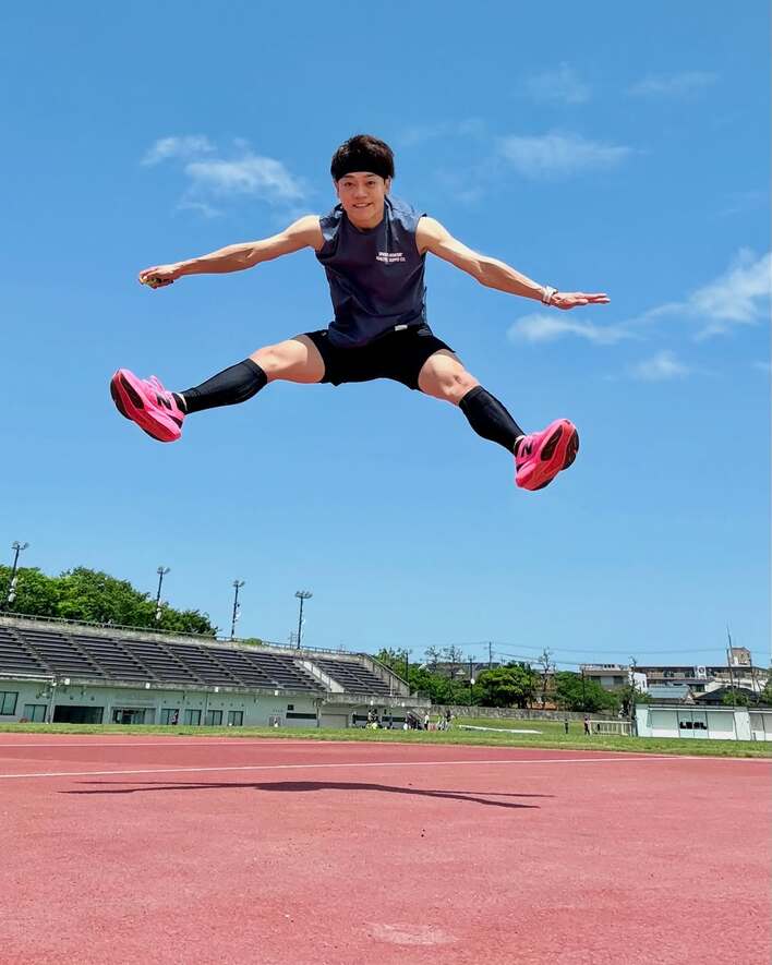 1枚目の写真では、両手を横に肩の高さまで伸ばし、両足のつま先をぐっと天の方へ向けて足を大きく横に開き、漢字の「土」のようなポーズでにっこり笑顔で宙高く跳んでいるおばたのお兄さんの姿が。