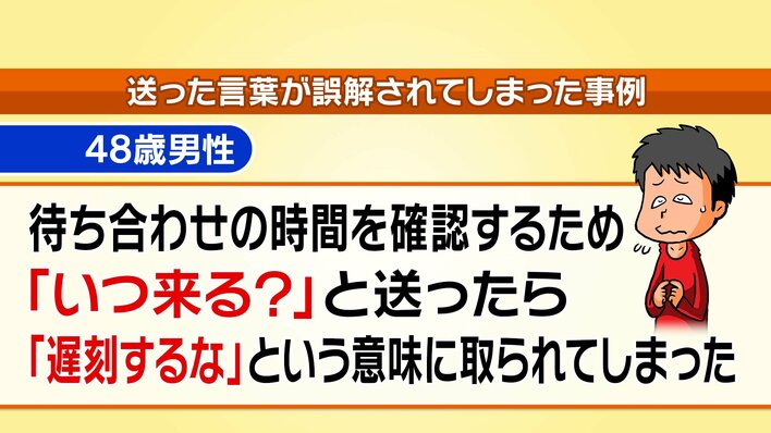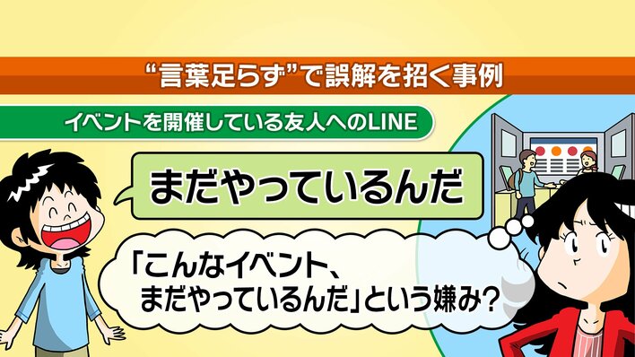 俵さんは、文字によるコミュニケーションでは「言葉足らずが原因で上手く伝わらないことが多い」と紹介。例えば、イベントを開催している友人に「まだやってるんだ」と送ったメッセージが、「まだやっているんだ!それなら行きたい」という意図のつもりが、「え、まだ開催しているの?」と嫌味のように受け取られる可能性もあると示唆。