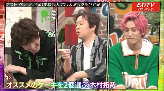 ホリの木村拓哉ものまねに大はしゃぎのりんたろー。は、「拓哉さんがケーキを選ぶやつ」と「オススメのケーキを2個選ぶ木村拓哉」のものまねをホリにリクエスト。ホリはショーケースをのぞき込む姿勢で「じゃ、この2つで」と、親指と小指の2本でケーキを指すポーズを決めて全員を大爆笑させていた。