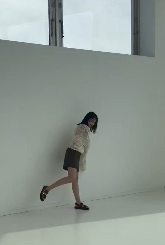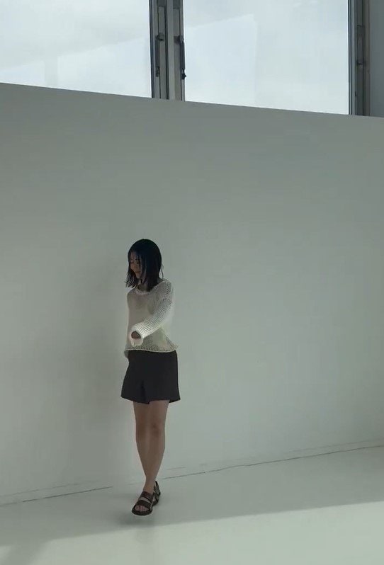真っ白なスタジオのような場所で、白の長袖ブラウスにブラウンのショートパンツスタイルの有村さん。