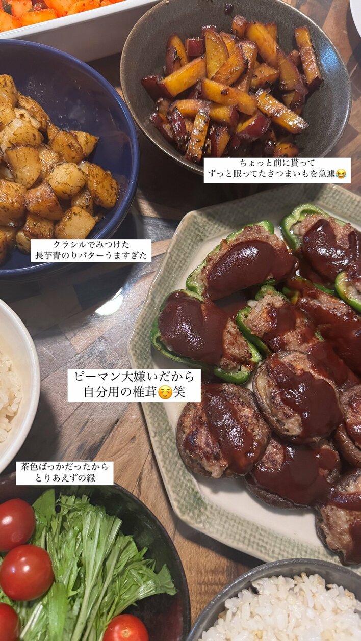 「ピーマン大嫌いだから 自分用の椎茸 笑」と書かれている通り、上半分は夫・大倉士門さん用のピーマンの肉詰め、下半分はみちょぱさん用のシイタケの肉詰めが並んでいます。
