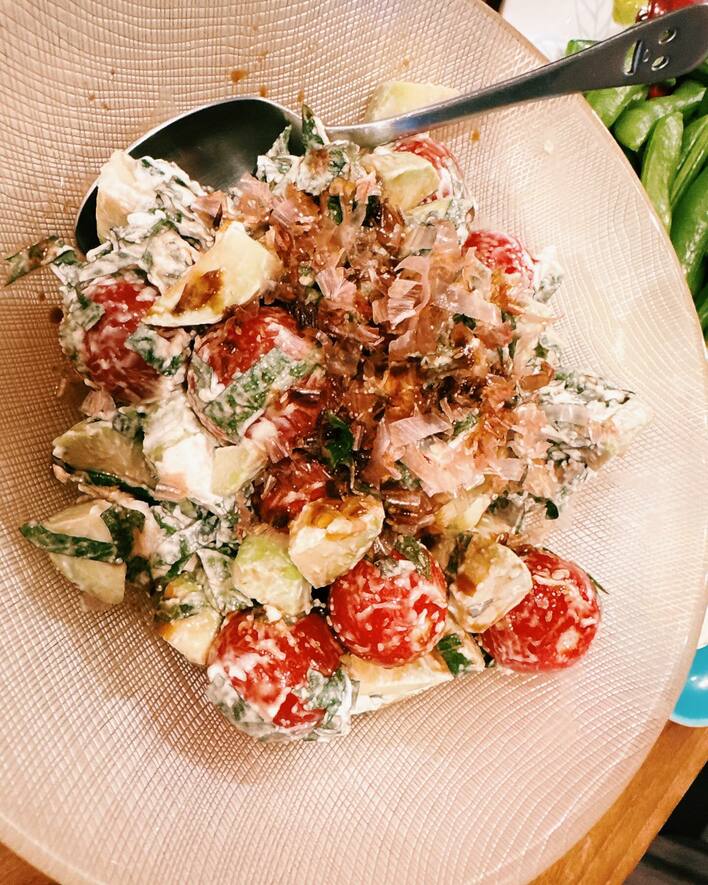 ホットプレートの近くには、アボカド、トマト、大葉 クリームチーズに、わさび醤油とかつお節をかけたというおつまみレシピも!