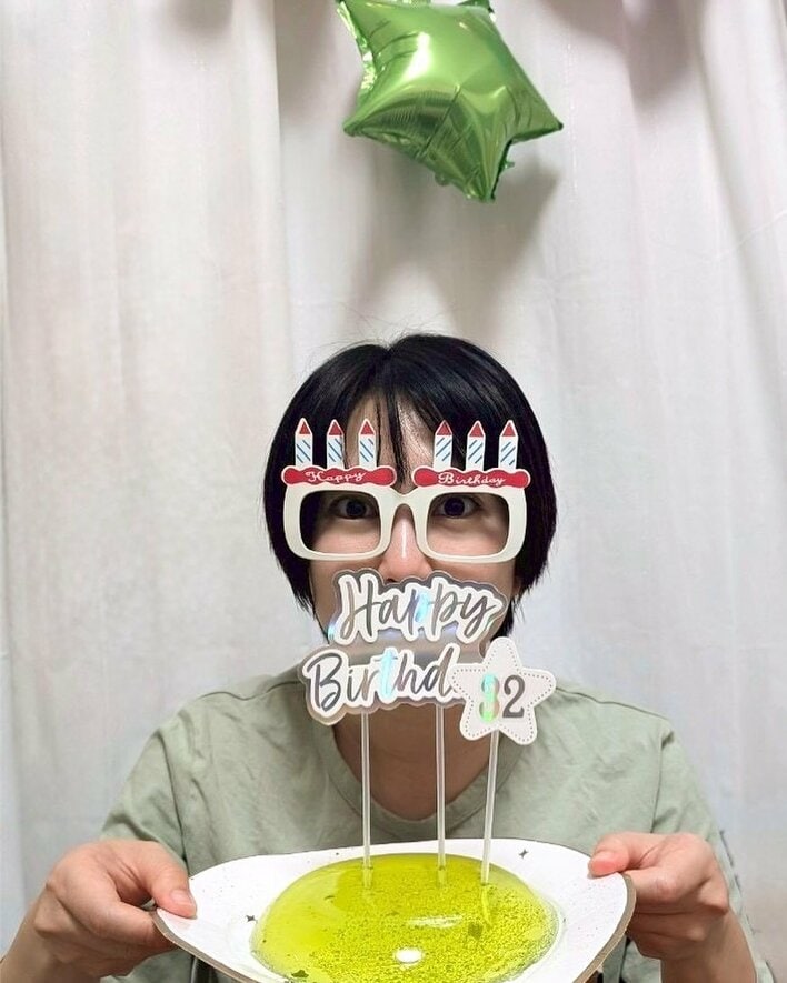 公開された写真には、カジュアルな淡いグリーンのTシャツを着て、ろうそくがデザインされたメガネをかけた志田さんの姿が。手にはバースデーケーキ・・・ではなく、巨大な緑色のゼリー!?