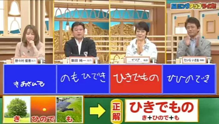 正解は「ひきでもの(き+ひので+も)」。イリア1人が正解。