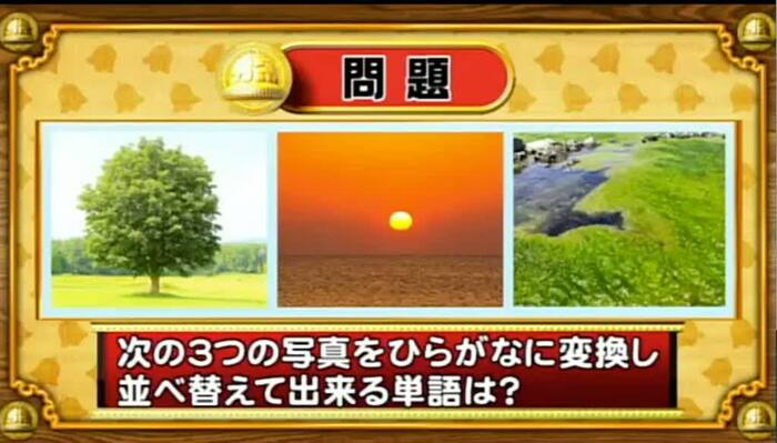 次は、シャッフル写真の問題。次の3つの写真をひらがなに変換し、並べ替えて出来る単語は何か?