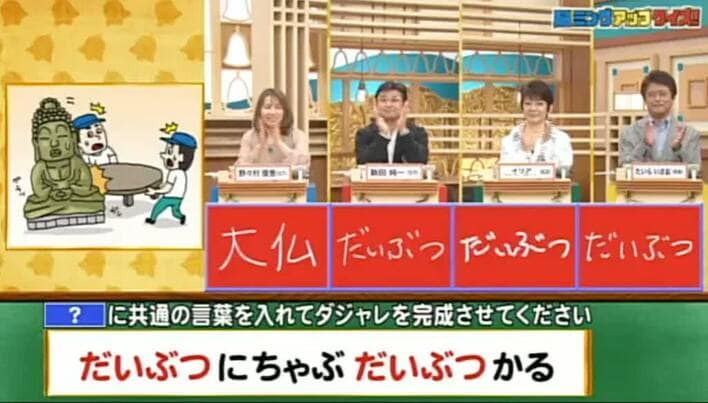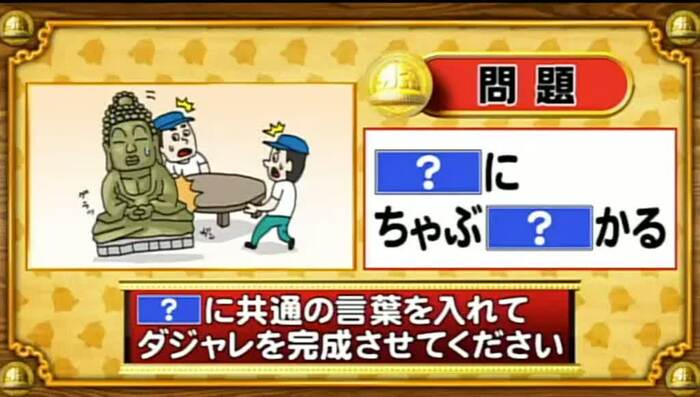 正解は「だいぶつ(大仏にちゃぶ台ぶつかる)」。見事に全員正解!