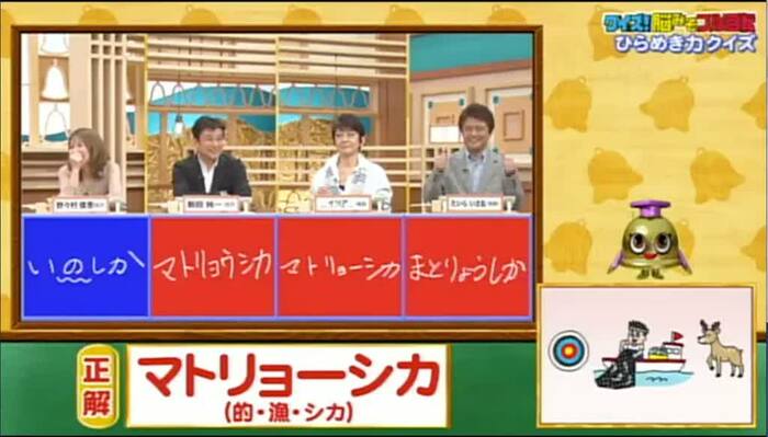 正解は「マトリョーシカ(的・漁・シカ)」。新田、イリア、たいらの3人が正解!