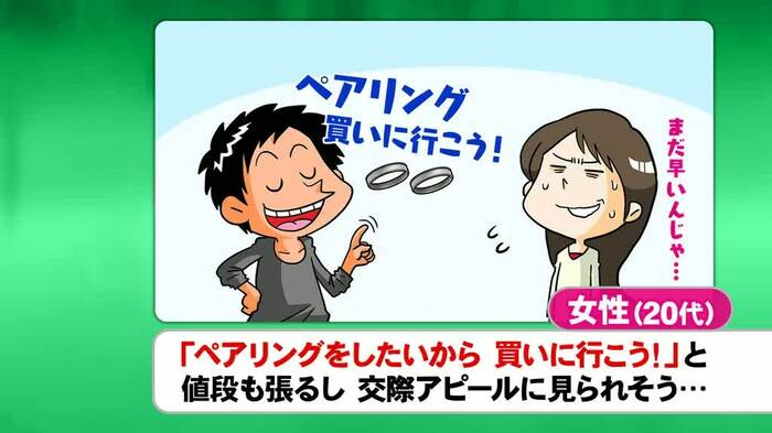 「付き合って1ヵ月の彼氏から『ペアリングを買おう』と言われて、モヤモヤする」「彼氏がクリスマスにサンタのコスプレでパーティしようと言ってきて、引いた」という20代女性のエピソードも紹介された。