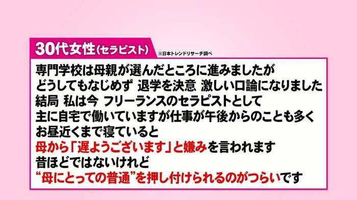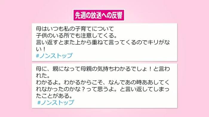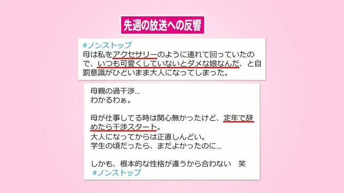 番組公式SNSには、母親の過干渉に悩んでいる人たちのエピソードが多く届き、「私も母親である自分を客観視しなきゃ!」「3歳までで恩返しが終わっていると言われると救われる」などの声も見られた。
