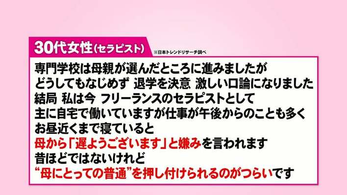 「仕事も家事も完璧だった看護師の母に言われるまま、看護の専門学校に入ったが、結局退学。母の反対を押し切ってセラピストとして働いているが、“母にとっての普通”を押し付けられるのが辛い」という、30代女性のお悩みも寄せられた。