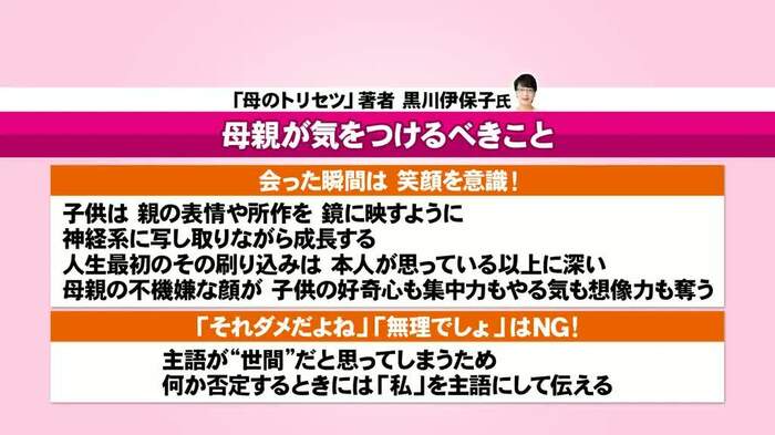 黒川氏は、子供に強い影響を与えてしまう母親が、気をつけるべきポイントも伝授。「久しぶりに会ったときは笑顔を意識」「子供を否定するときは、『私はこう思う』と主語を“私”にすることが必要」という黒川氏のアドバイスに、藤本は「母親、難しい!」と頭を抱え、スタジオの笑いを誘った。