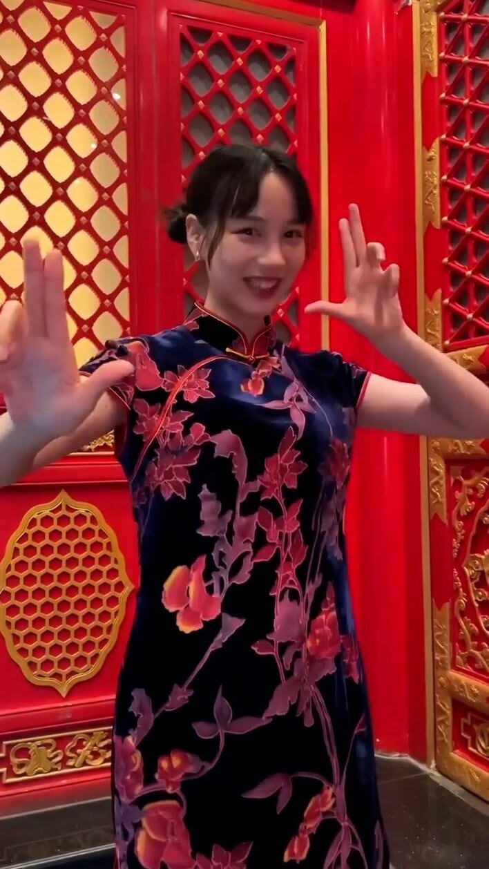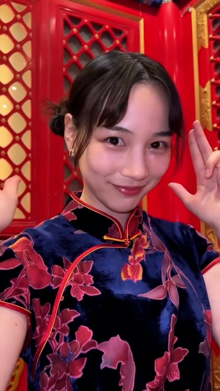 中国の北京を訪れたのんさんは、お団子ツインに結った髪と紺色に赤い花の柄が美しいチャイナドレス姿を披露しました。