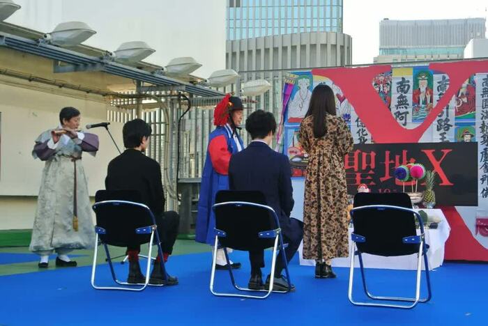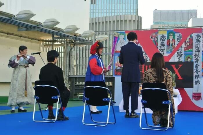 そして、横笛演奏者の奏でる音色にあわせ、シャーマンであるイ・キュジョンさんが祝詞をあげ、岡田、川口、薬丸が厳かな雰囲気の中で祭壇に酒を奉納。続けて、大ヒット祈願のお札を岡田らがキュジョンさんに手渡し、祭祀を終えた。
