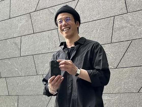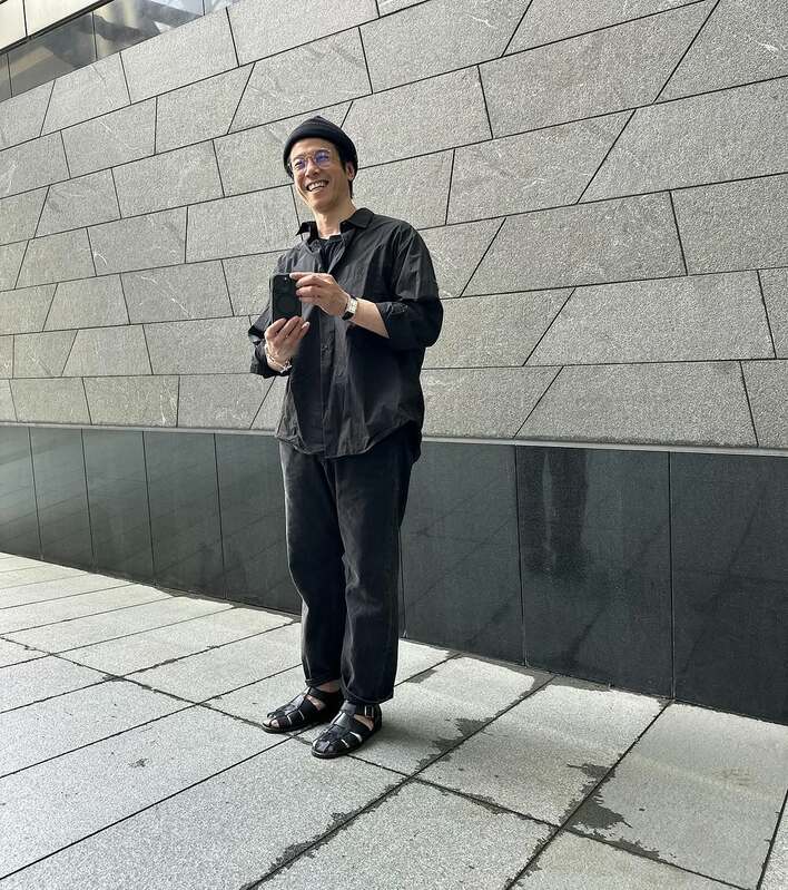 ファッションを見ていくと、黒の襟付きシャツに黒のズボン、黒のニット帽子をかぶり、黒のサンダルを履いた、全身ブラックに仕上げています。