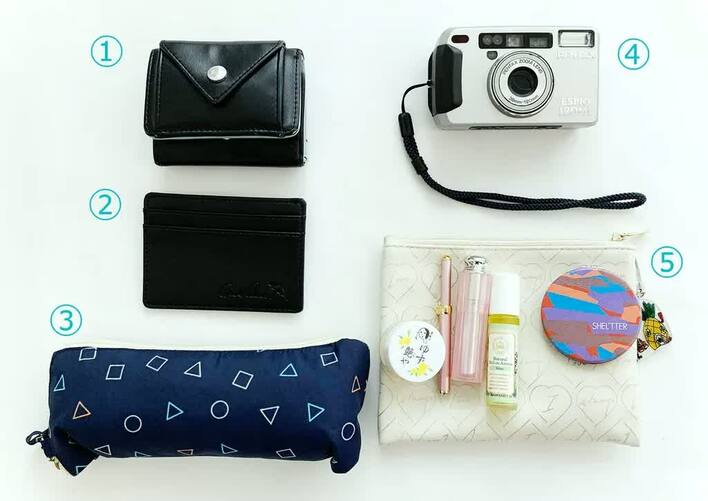 お財布は持ち歩きやすいミニ財布を愛用。小振りなメイクポーチには、リップクリーム、色付きリップ、ミニミラーといった厳選されたお直し用のメイクグッズが。