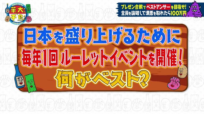 博多華丸さん、博多大吉さん、大悟(千鳥)さん、ノブ(千鳥)さん、山内健司(かまいたち)さんを含めた6人が、お題に対して各自ベストアンサーだと思う回答を出し、プレゼン合戦。