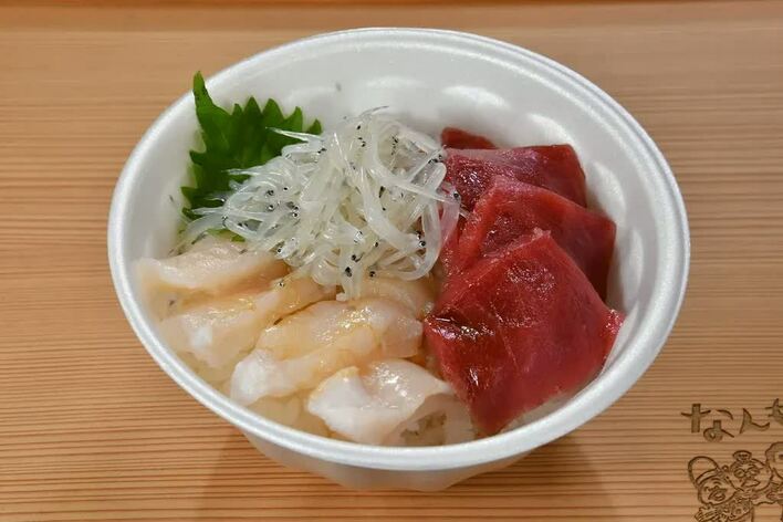続いて向かったのは「安亀商店」。「八郎潟産のシラウオですよ」と自信満々の表情のお店の方から、おたまでどっさりと八郎潟産シラウオの刺身(50g)をのせてもらうと、松岡は「こういう風にかけちゃっていいわけですね」と手持ちのしょうゆを丼に回しかける。