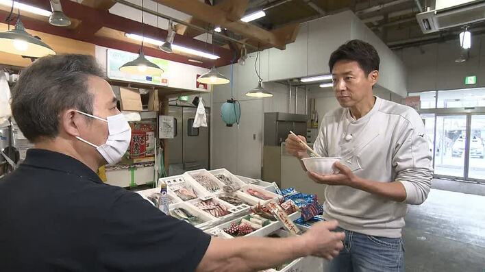 ここまでで残りは1分半、松岡は「どこで獲れるホタテでしょうか?」と質問するなど、まだまだ余裕を見せる。三陸産ホタテ60gをのせてもらった松岡は、「時間あとどのくらい?」と時間を気にしはじめ、「あと1分しかない!」と小走りで市場を進んでいく。