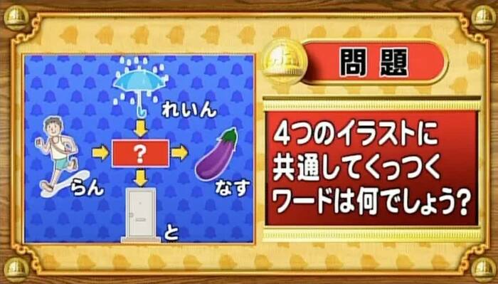 最初は「脳ミングアップクイズ」から、くっつきワードの問題。次の4つのイラストに共通してくっつく言葉は何でしょうか。