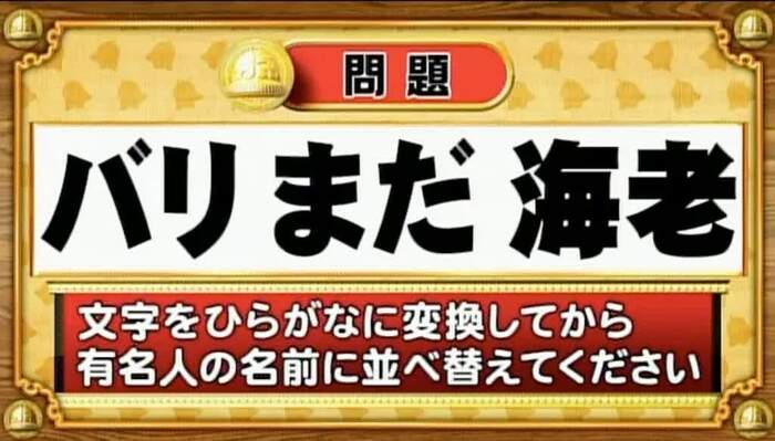次は、シャッフル人名問題。次の文字をひらがなに変換し、有名人の名前に並び替えてください。