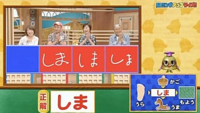 正解は「しま(浦島、鹿児島、しま模様、シマウマ)」。中村さん、上村さん、竜さんの3人が正解!