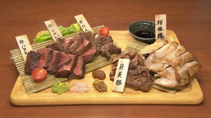 アンガス牛のハラミや桜姫鶏など、5種類の超厚切り肉を楽しめる炭焼塊肉おまかせ5種盛り(2980円)は、お店の看板メニュー。レモンサワー(340円)で乾杯。 ※すべて税別