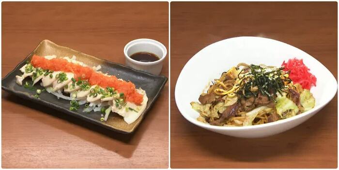 国産の鶏むね肉を使用した鶏タタキ(790円)は、ポン酢でさっぱりといただける夏にぴったりの一品。ほか、焼きそば(ソース/680円)をいただき、金宮(水割り/380円)で乾杯。※すべて税別