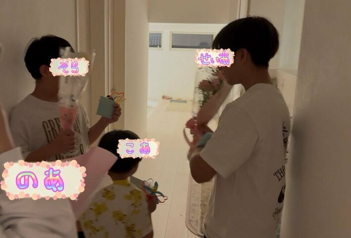 長男の青空(せいあ)さんの手には、ピンクのカーネーションや白いお花でできた花束が用意されていて、子供たちが辻󠄀さんのことを大好きな様子が伝わってきます。