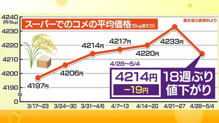 価格高騰で値上がりが続いていたコメの平均価格が、18週ぶりに5kgあたり19円値下がりし、4214円(5kg)となりました。