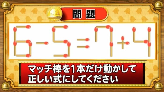 「6-5=7+4」。この式のマッチ棒を1本だけ動かして正しい式にしてください。