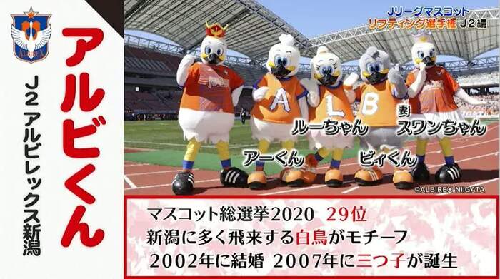新潟に多くやってくる白鳥がモチーフ。妻のスワンちゃん、三つ子たちとともにSNSで情報を発信するなど、アルビレックスを盛り上げている。