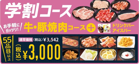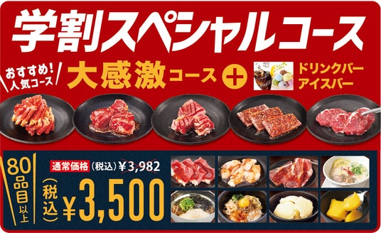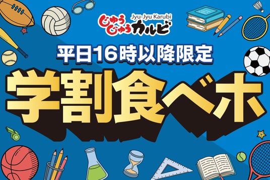 株式会社トマトアンドアソシエイツ(本社:兵庫県西宮市、代表取締役社長:笹村 啓介)が運営する、焼肉食べ放題「じゅうじゅうカルビ」では、2025年5月15日(木)より、平日ディナータイム限定で「学割コース」を販売いたします。「学割コース」は選べる2コースで、いずれもドリンクバーとアイスバーがセットになっております。